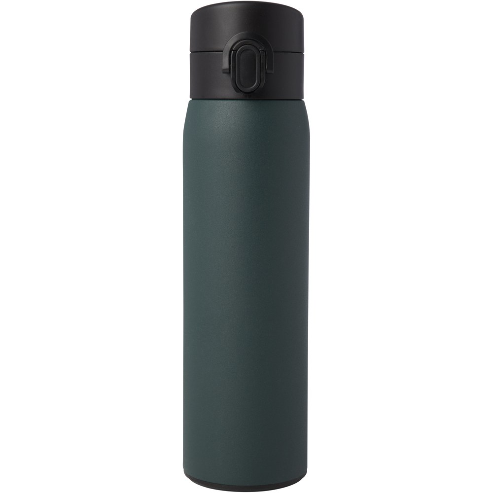 Elegante termo con aislamiento de acero inoxidable reciclado con certificación RCS y sencillo mecanismo de apertura mediante un botón. El termo es hermético y, gracias a su aislamiento de cobre, las bebidas se mantendrán calientes o frías durante varias horas. Capacidad de 450 ml. Se presenta en una caja de regalo de cartón reciclado.
