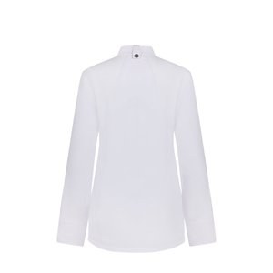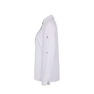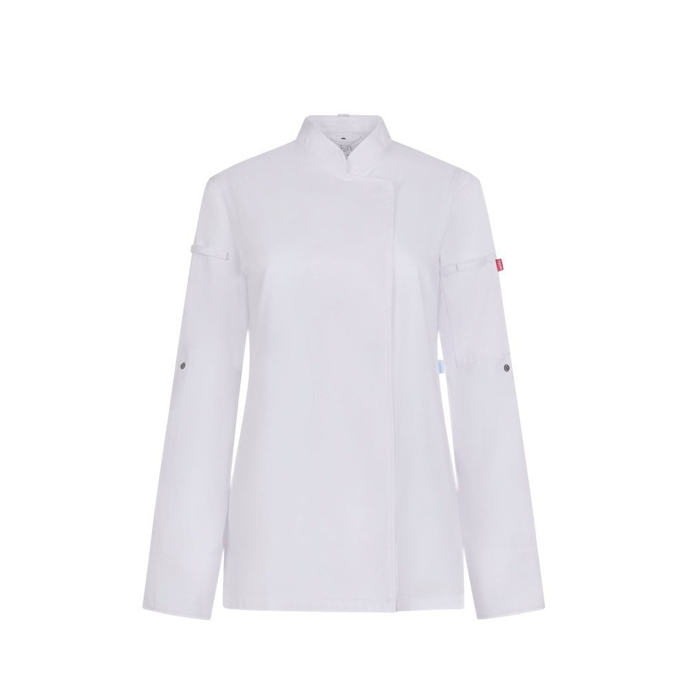 Chaqueta de cocina para mujer (190 g/m²) confeccionada en algodón (35 %) y poliéster reciclado (65 %). Con un diseño femenino y cómodo, tejido repelente a los líquidos y espalda en tejido COOLMAX transpirable. La chaqueta tiene una cremallera central con botones ocultos. Talla: XS, S, M, L, XL, 2XL